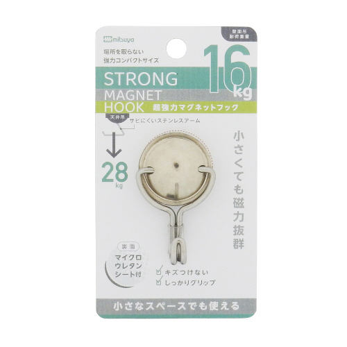 壁面吊耐荷重16KGのコンパクトマグネットフック。裏面にはウレタンマイクロ加工シート貼合で磁着面をしっかりグリップ。