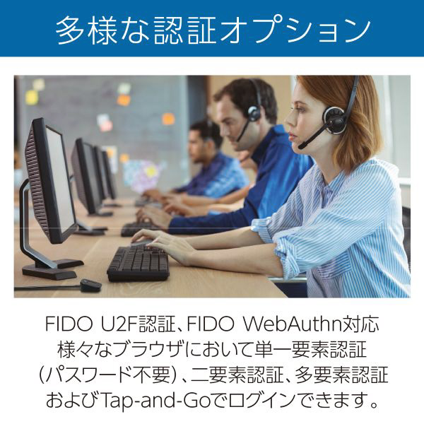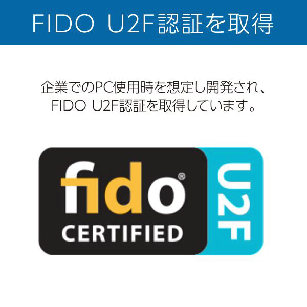 最先端の生体認証技術を搭載したVeriMarkデスクトップ指紋認証キーは、指先でビジネスにおいて使用するPCのセキュリティを強化することを可能にします。企業でのPC使用時を想定し開発され、VeriMarkデスクトップ指紋認証キーはFIDO U2F認証を取得しており、またFIDO2 WebAuthn対応です。