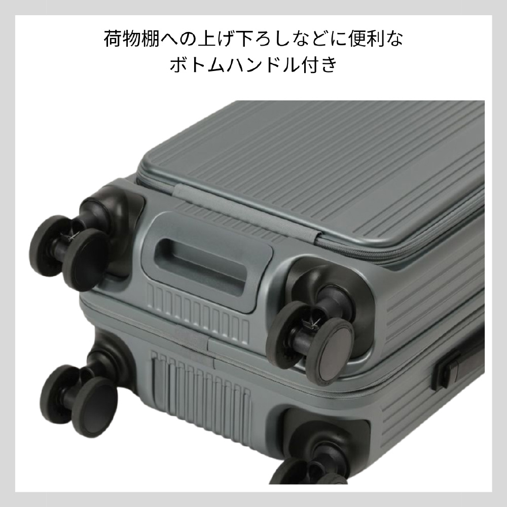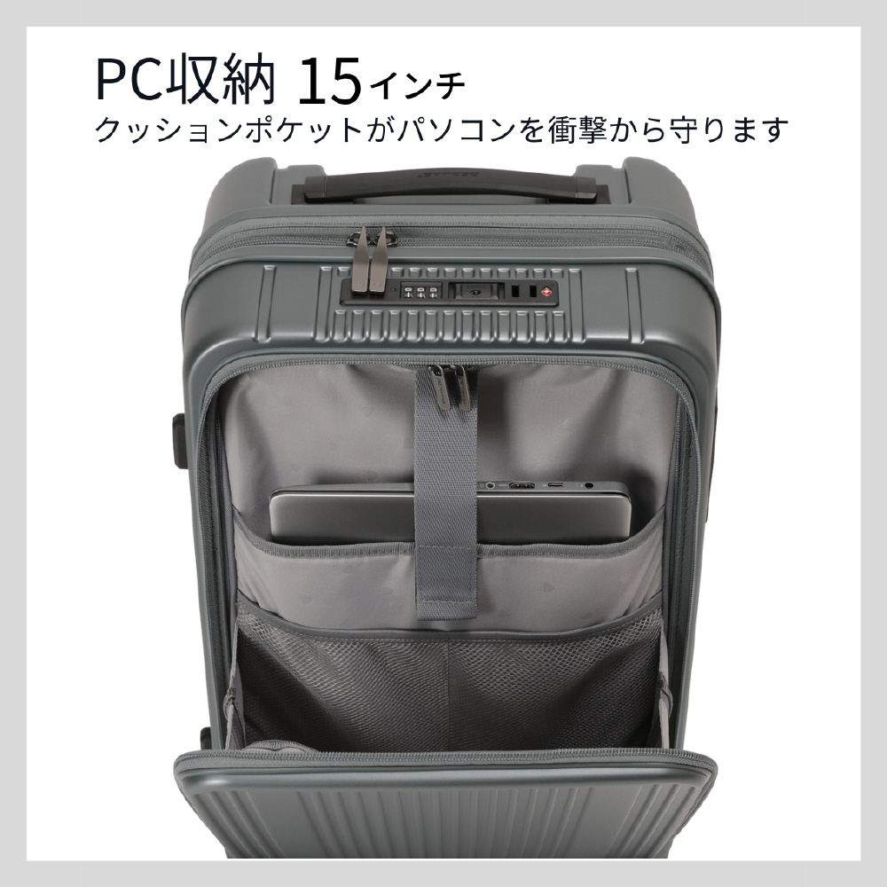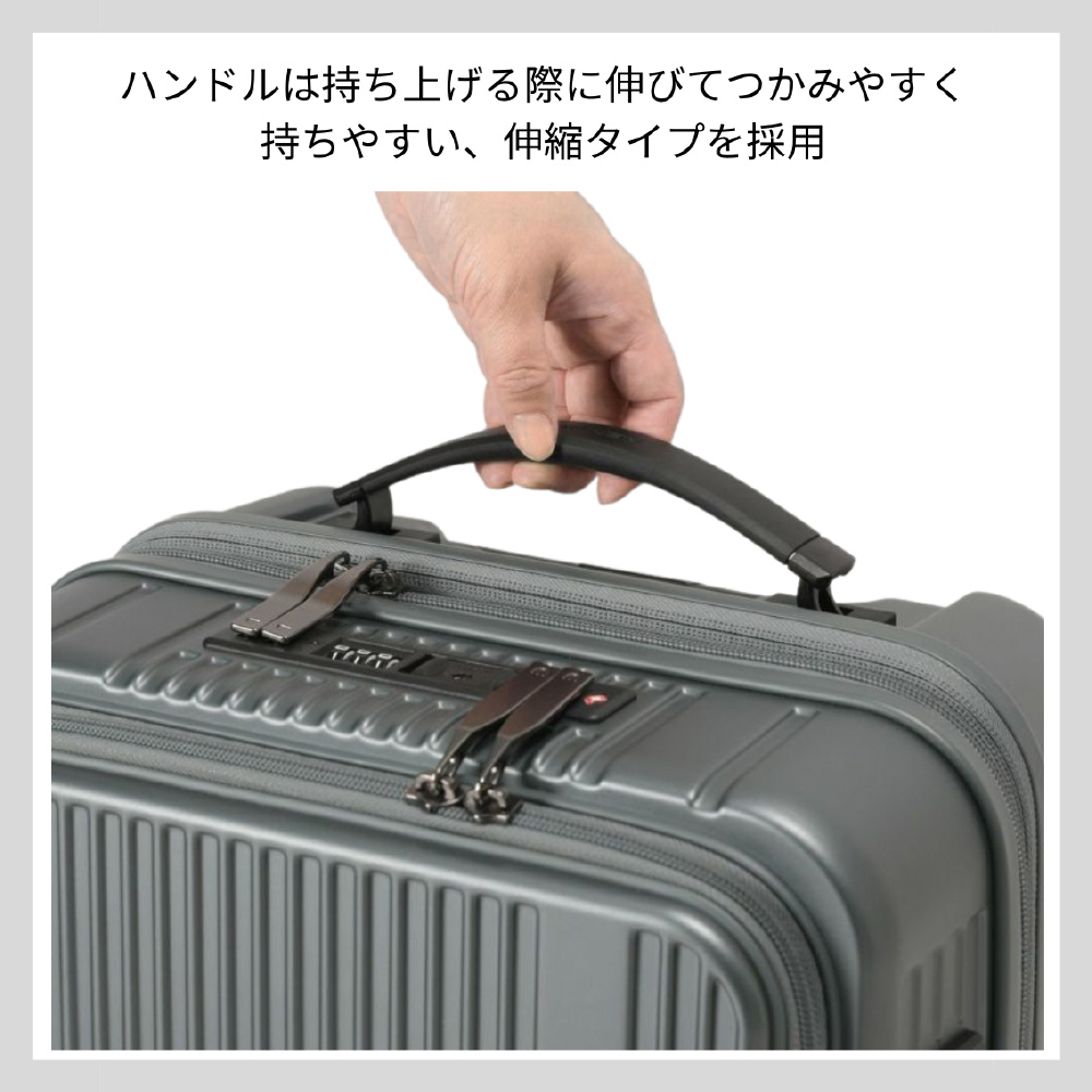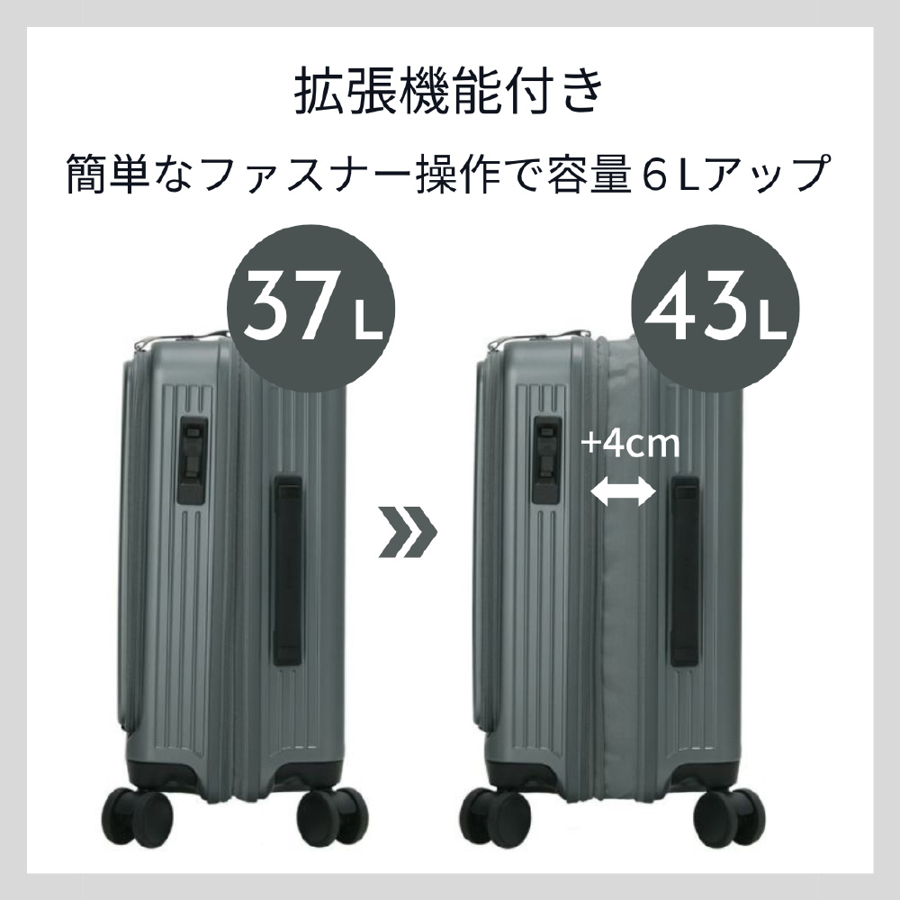 軽量かつ頑丈なポリカーボネート100%素材を採用し、傷が目立ちにくい縦リブデザインで高い強度と上質感を両立。通勤から出張・旅行まで幅広く対応できるフロントオープンタイプのスーツケースです。荷物の増減に応じて約37L→43Lへ拡張可能なエキスパンダブル機能も搭載しています。