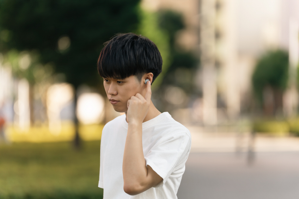 極小サイズによる高い遮音性能に加え、このサイズでは異例の「ノイズキャンセリング」を搭載しました。独自のアルゴリズムにより、音質と遮音性を両立したノイズキャンセリングに加え、周囲の音を聞き取りやすくする「アンビエントモード」を搭載。L側のワンタッチで切替が可能で、電車の車内等で咄嗟にアナウンスを聞きたいときなどに、装着したままで自在に切替が可能です。