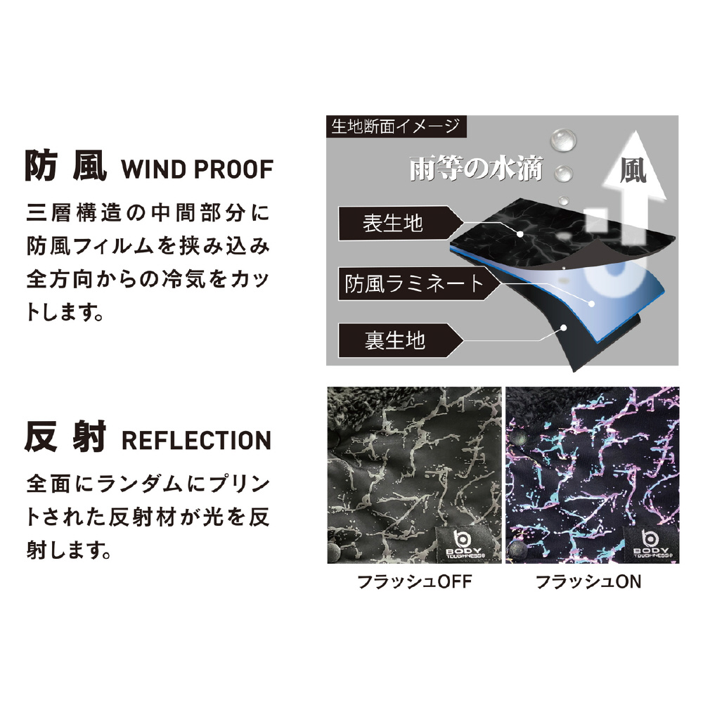 ●防風:三層構造の中間部分に防風フィルムを挟み込み、全方向からの冷気をカットします。●反射:全面にランダムにプリントされた反射材が光を反射します。●サイズ:FREE。●品質:ポリエステル100%、フィルム/ポリ塩化ビニル