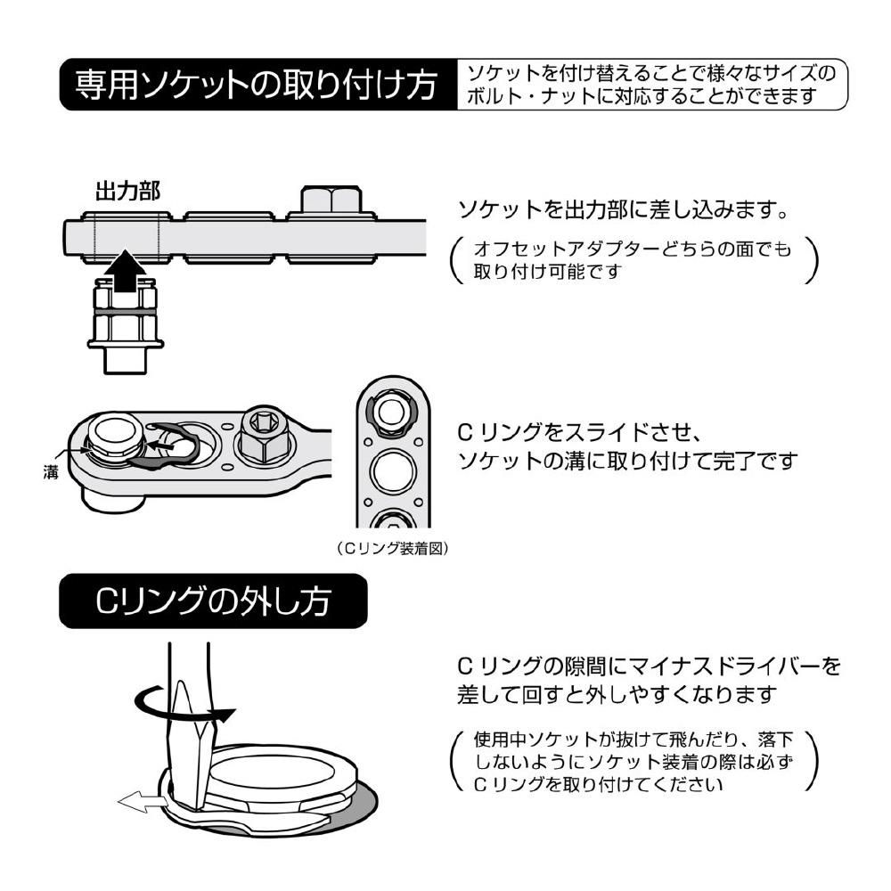 【仕様】<BR>●入力部:H17六角、6.35六角 出力部:H17六角(二重六角)<BR>●40V対応(18Vにも対応)<BR>【材質】<BR>本体:炭素鋼、合金鋼、PP、TPE<BR>ソケット:合金鋼<BR>Cリング:炭素鋼<BR>止め輪付ビット:炭素鋼<BR>【セット内容】<BR>●オフセットアダプター本体(H17mm対応)<BR>●H8/10/12/13/14/17/19/21mmソケット<BR>●止め輪付ビット