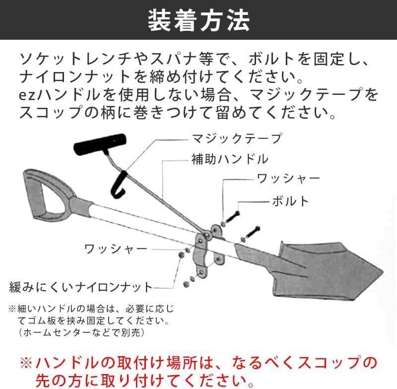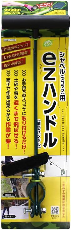 【特長】<BR>人気のezシャベルの使用感をお手持ちのシャベルでも!<BR>シャベル(スコップ)用の補助ハンドルのezハンドル。<BR>補助ハンドルを装着する事により、支点を増やし力を分散!<BR>無駄な力を使わず体への負担を軽減します。<BR>しゃがまず快適に作業できるの疲労を軽減して、作業効率もアップ。<BR>・お手持ちのスコップに取り付けるだけ!<BR>・土砂や雪を遠くまで飛ばせる!<BR>・両手で作業できるから作業が楽!<BR>※単品での使用はできません。<BR>【仕様】<BR>ハンドル長さ:約33cm<BR>重量:約230g<BR>色:モスグリーン<BR>【注意】<BR>10mmのソケットレンチやスパナ等、ナット等を固定する工具が2本必要です。<BR>【材質】<BR>スチール(焼入れ済・樹脂粉末焼付塗装)、柄:椎材(焼き柄)、ハンドル:PP