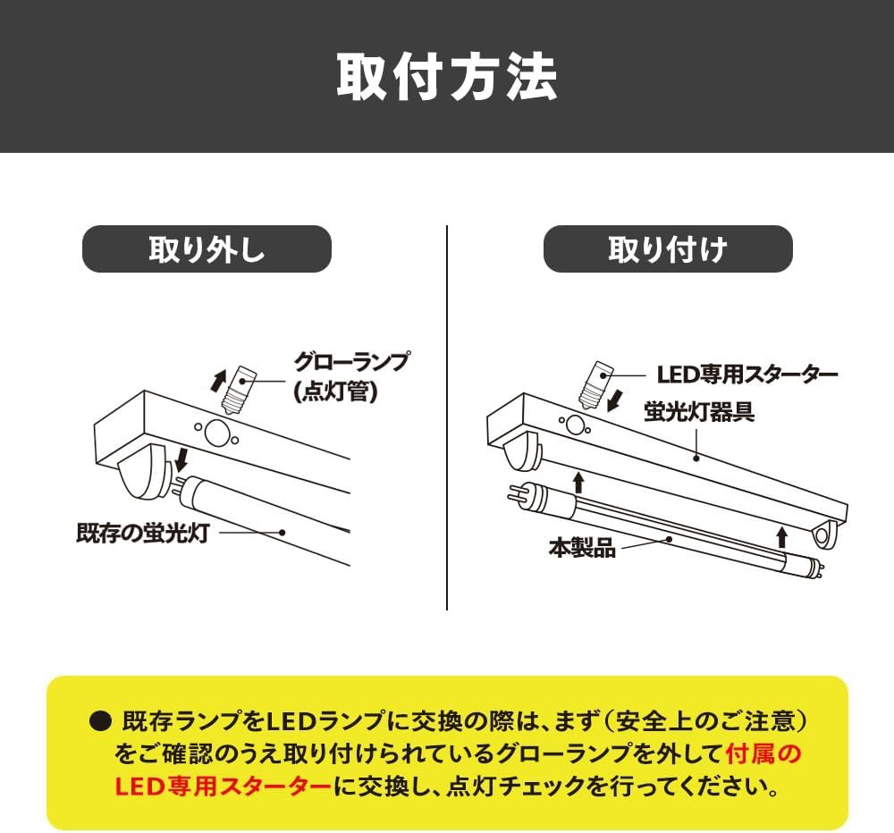 注意事項:グロースターター式(FL)以外の方式(ラピッド式(FLR)、インバーター式(HF))の器具に取り付ける場合は、AC電源の直結工事をする必要があります。 事前に点灯方式(安定器)をご確認ください。