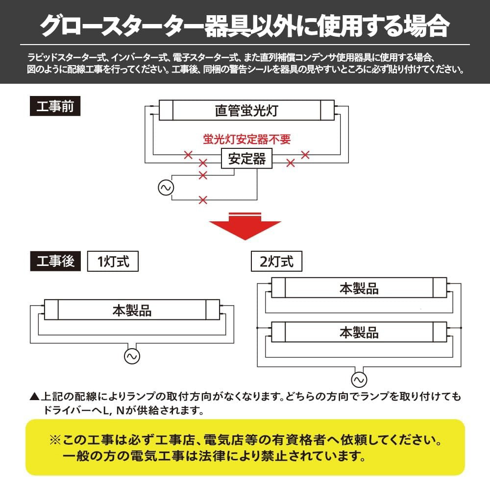 注意事項:グロースターター式(FL)以外の方式(ラピッド式(FLR)、インバーター式(HF))の器具に取り付ける場合は、AC電源の直結工事をする必要があります。 事前に点灯方式(安定器)をご確認ください。