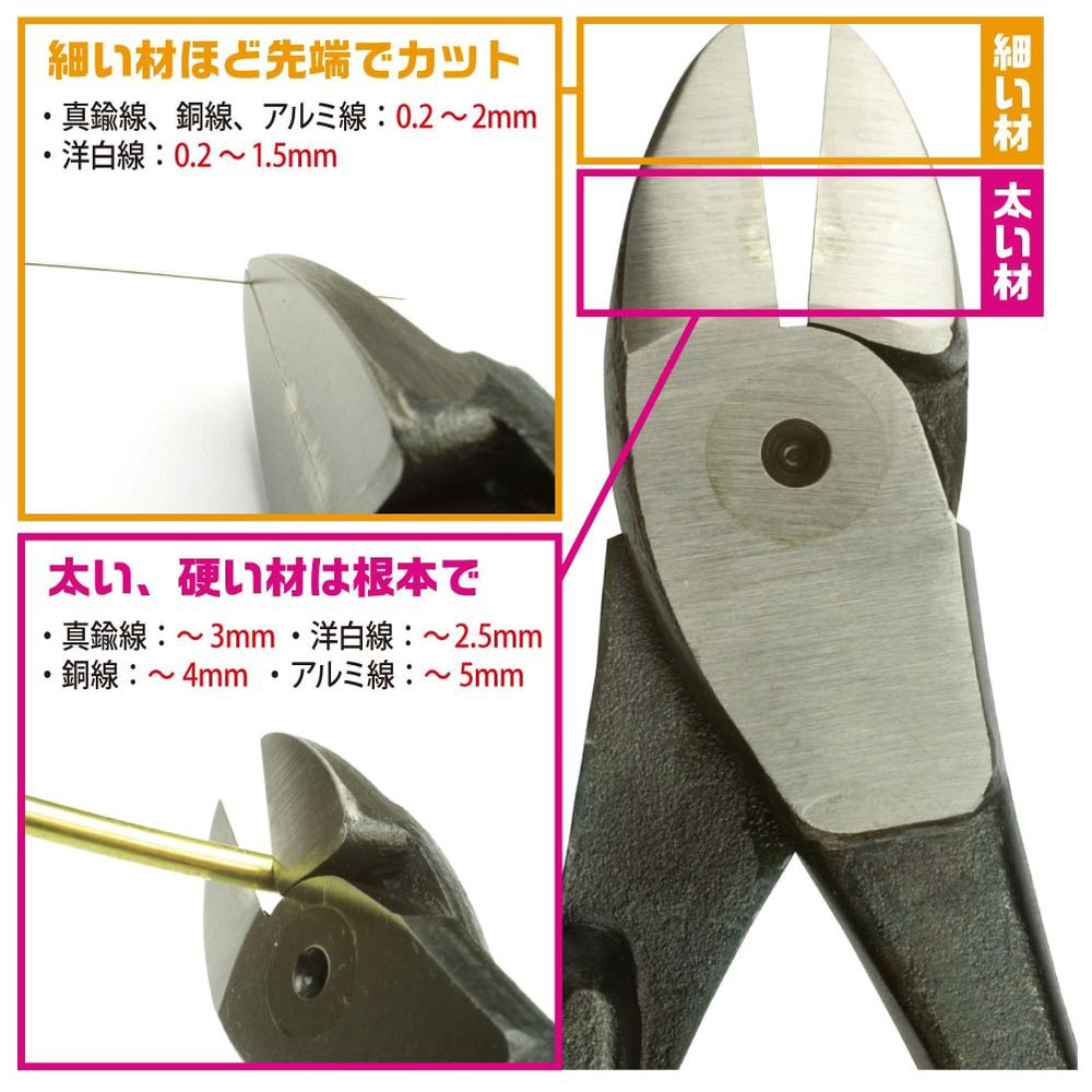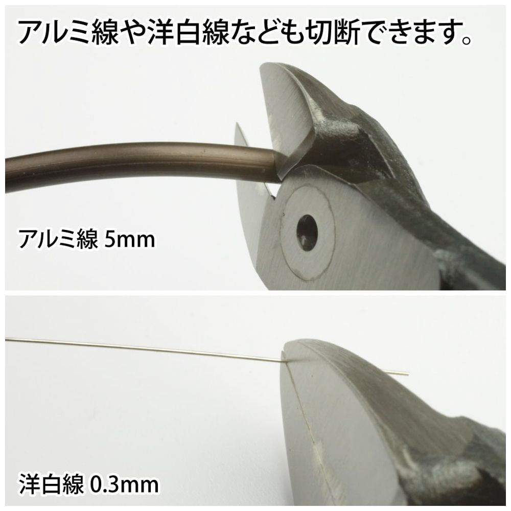 軟金属線Φ0.2mmからアルミ線の場合は最大Φ5mmまで、幅広い素材を切断することができます。