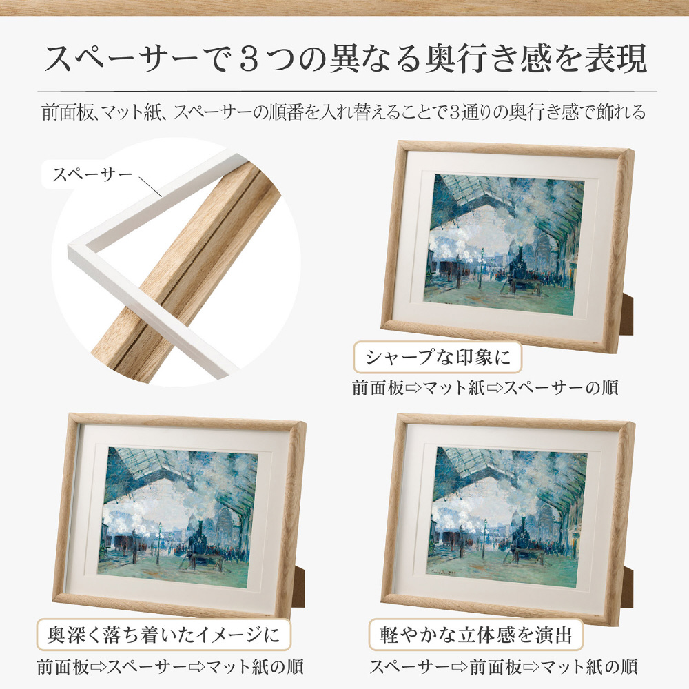 前面板やスペーサーの順番を入れ替えることで、3通りの異なる奥行き感を表現できる木製フォトフレーム。