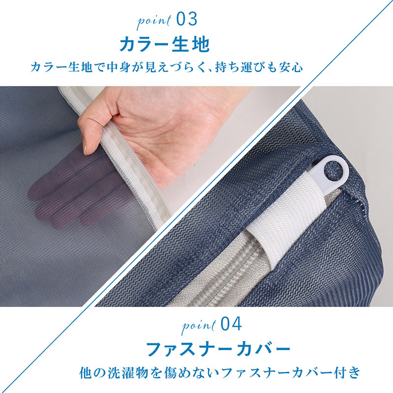 【ご注意】●ドラム式洗濯機または乾燥機を使用しないでください。●塩素系の洗剤や漂白剤は使用しないでください。●洗濯は弱流水、脱水は弱をお勧めいたします。脱水が終わるまでネットに入れたままご使用ください。