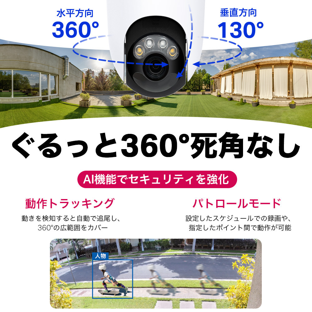 水平方向に360°・垂直方向に130°の首振りに対応し、広範囲をカバーします。