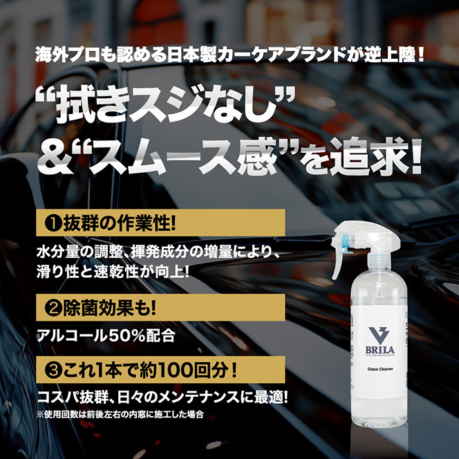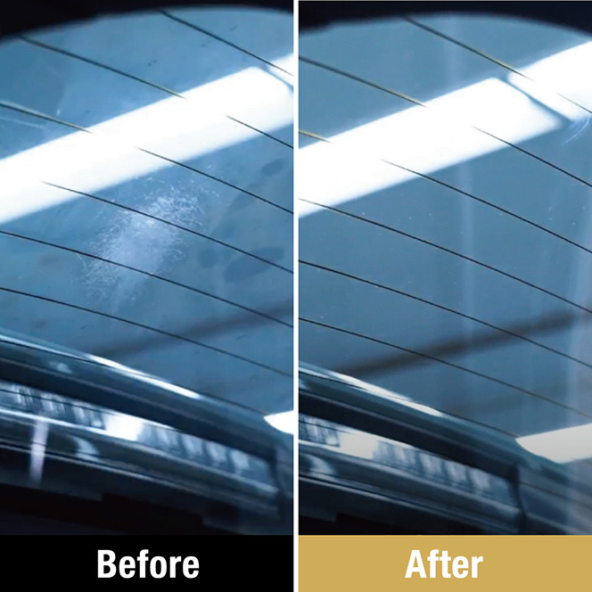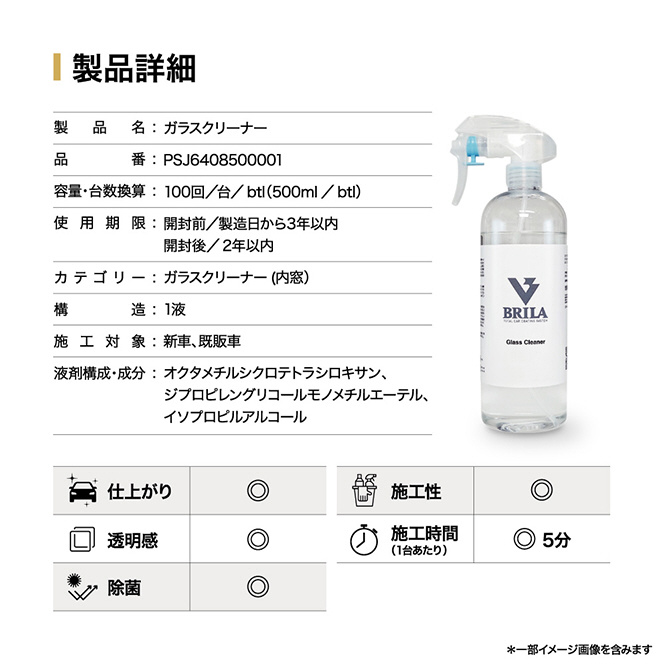 溶剤成分がガラス表面のしつこい汚れを溶解し、塗布・拭き上げ後の「透明感」を実現。