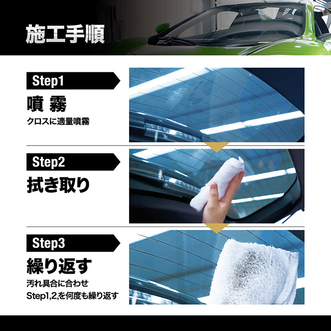乾いた綺麗なクロスにクリーナーを適量噴霧し、汚れが見えなくなるまでガラス面をムラなく拭き上げてください。