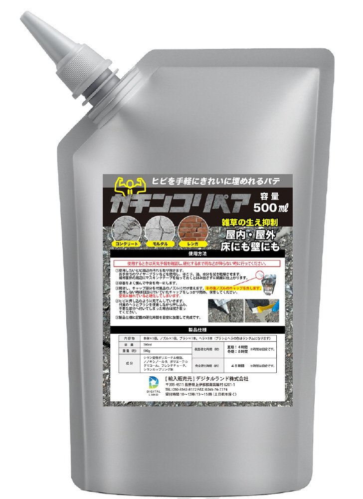 ひび割れに流し込むだけで簡単に補修できる便利な補修材です。細ノズルで手軽に使え、屋内外問わず幅広く対応。雑草の発生も防ぎ、日々の手入れがぐっと楽になります。