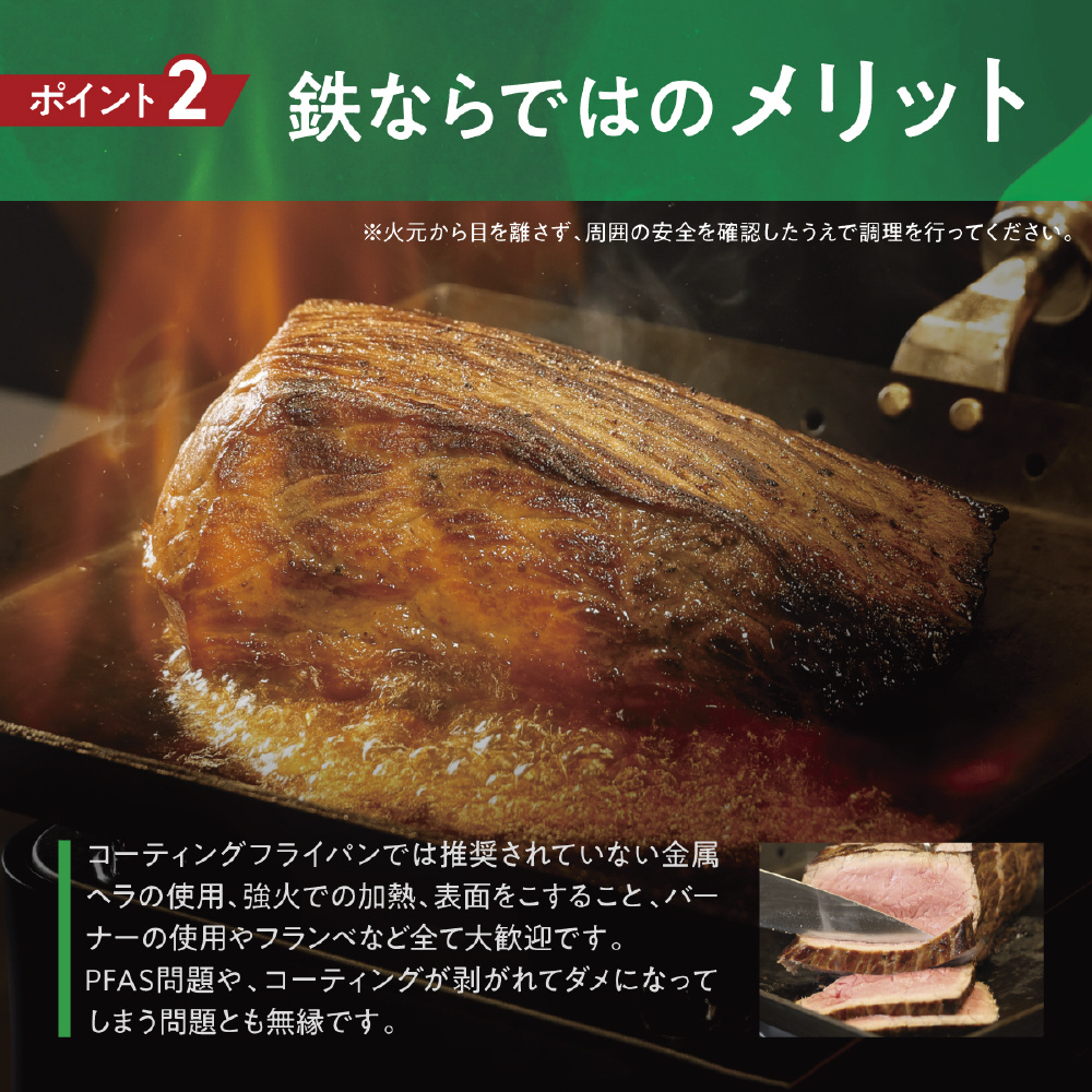 厚みのある鉄製フライパンで蓄熱性抜群だからアツアツ長持ち。