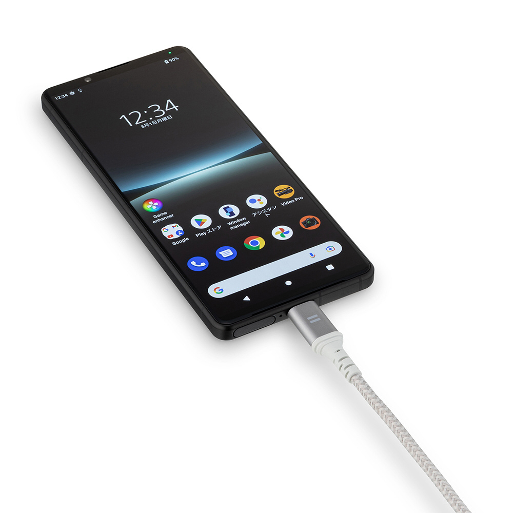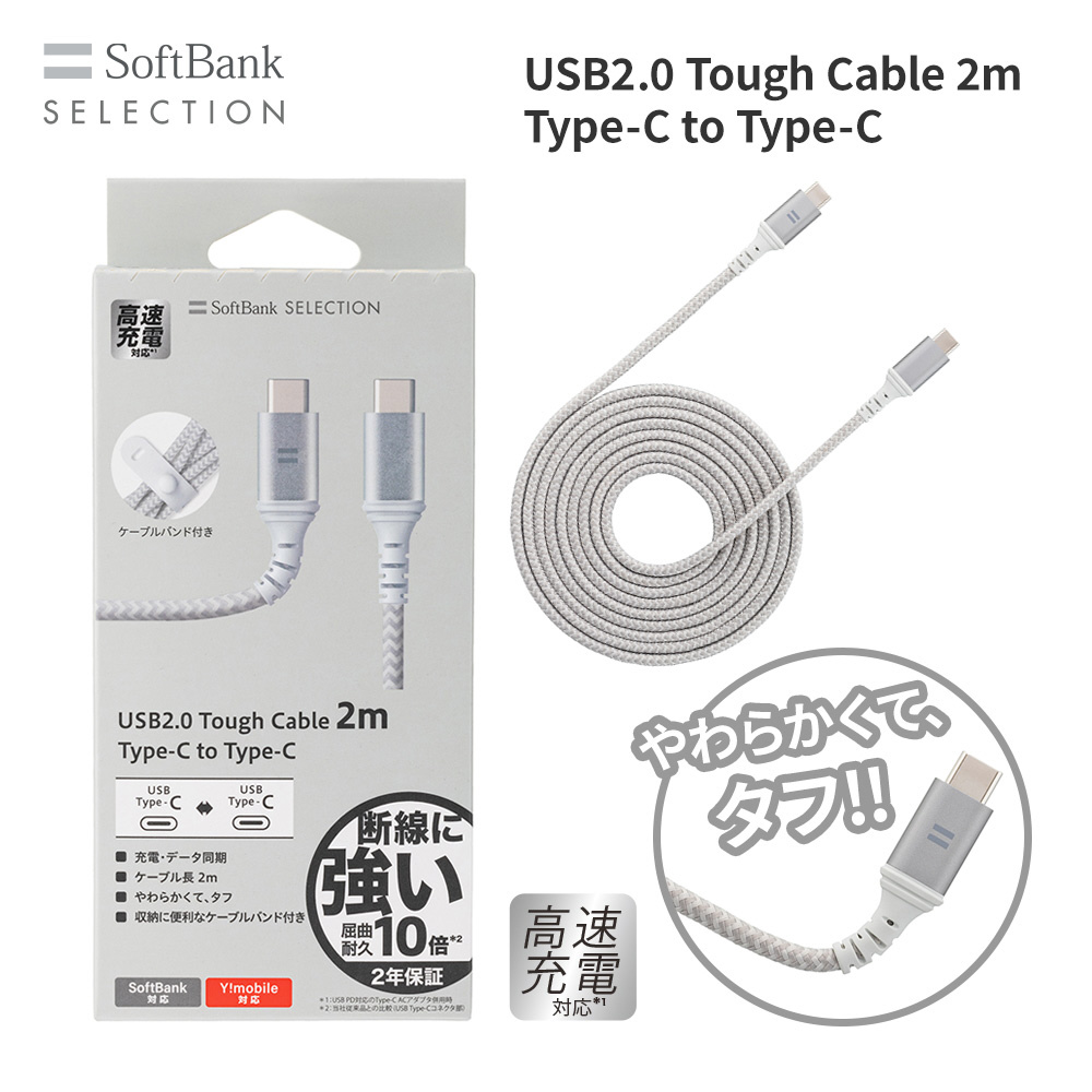 屈曲耐久10倍で断線に強い/やわらかくて、タフ/高速充電対応/収納に便利なケーブルバンド付き