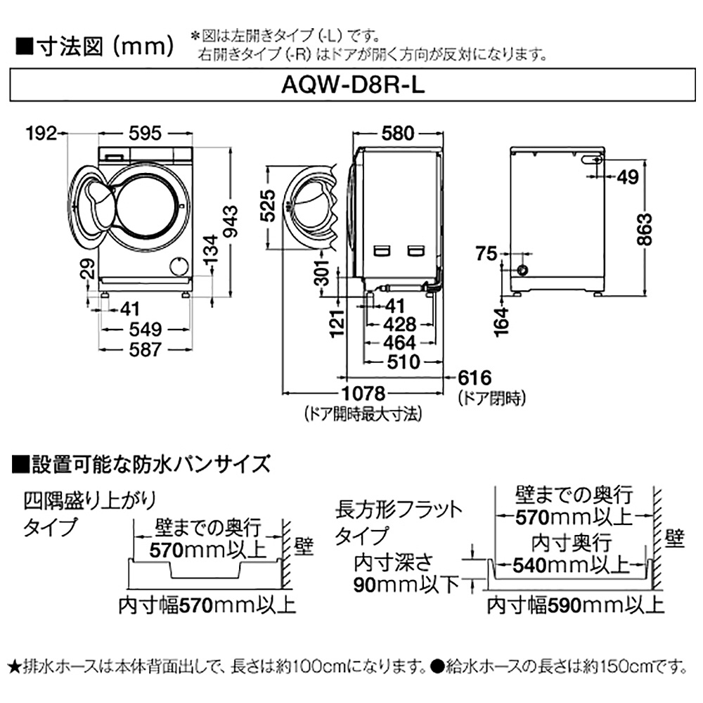 ※1:設置可能な防水パン:内寸幅590mm、内寸奥行540mm、壁までの奥行570mm以上