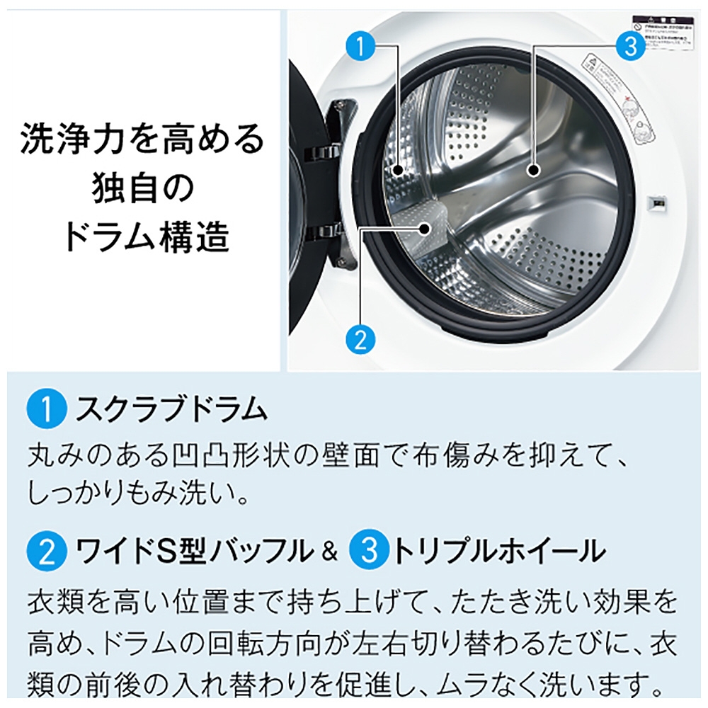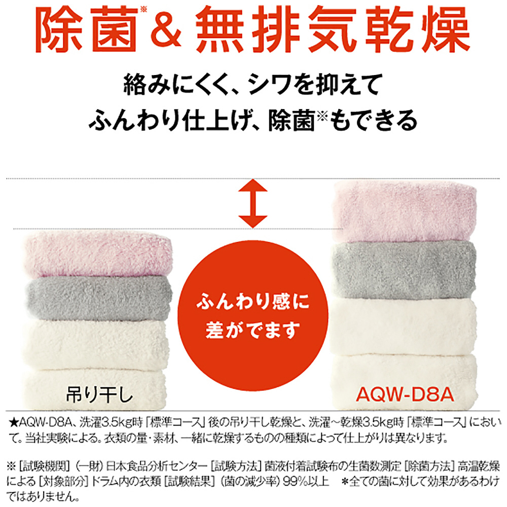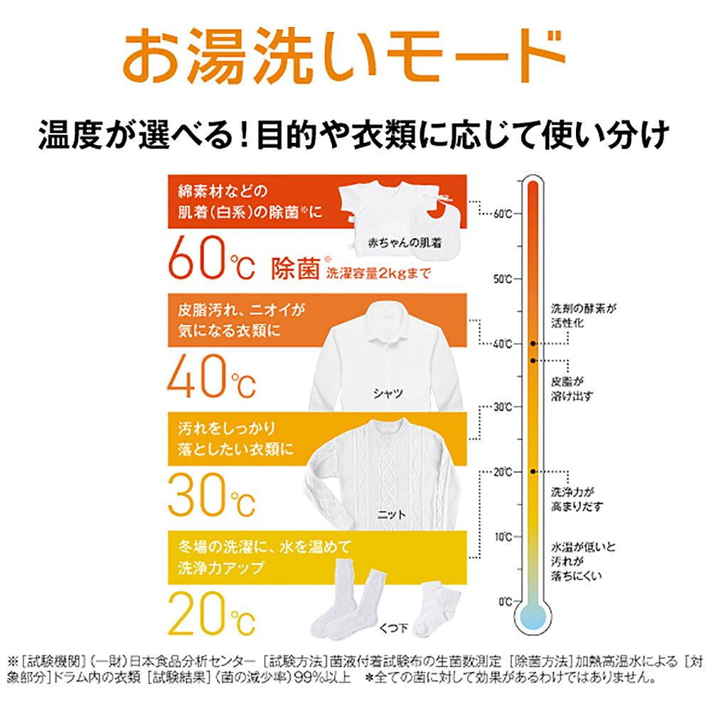 ※3:[試験機関](一財)日本食品分析センター [試験方法] 菌液付着試験布の生菌数測定 [除菌方法] 高温乾燥による [対象部分]ドラム内の衣類 [試験結果](菌の減少率)99%以上 *全ての菌に対して効果があるわけではありません。