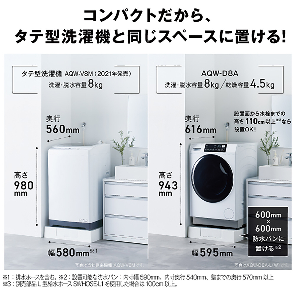 ・60cm角防水パンに置ける※1薄型8kg※2「まっ直ぐドラム」