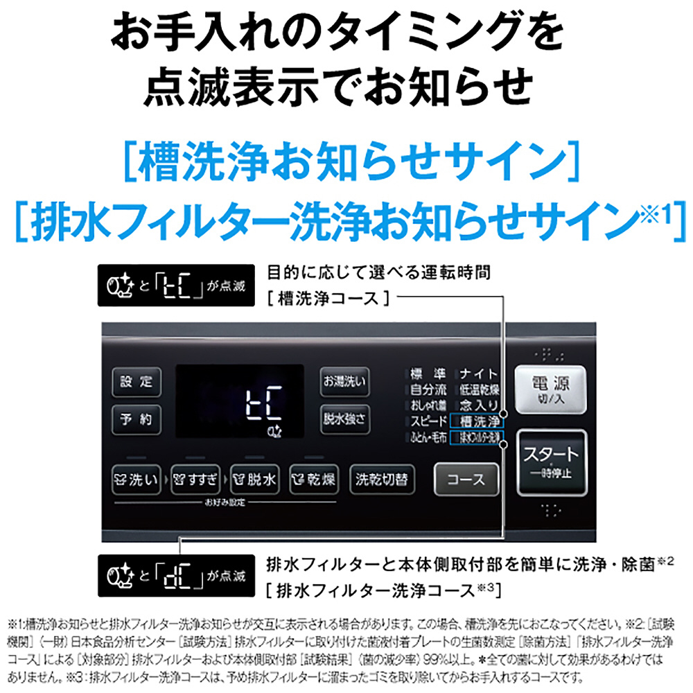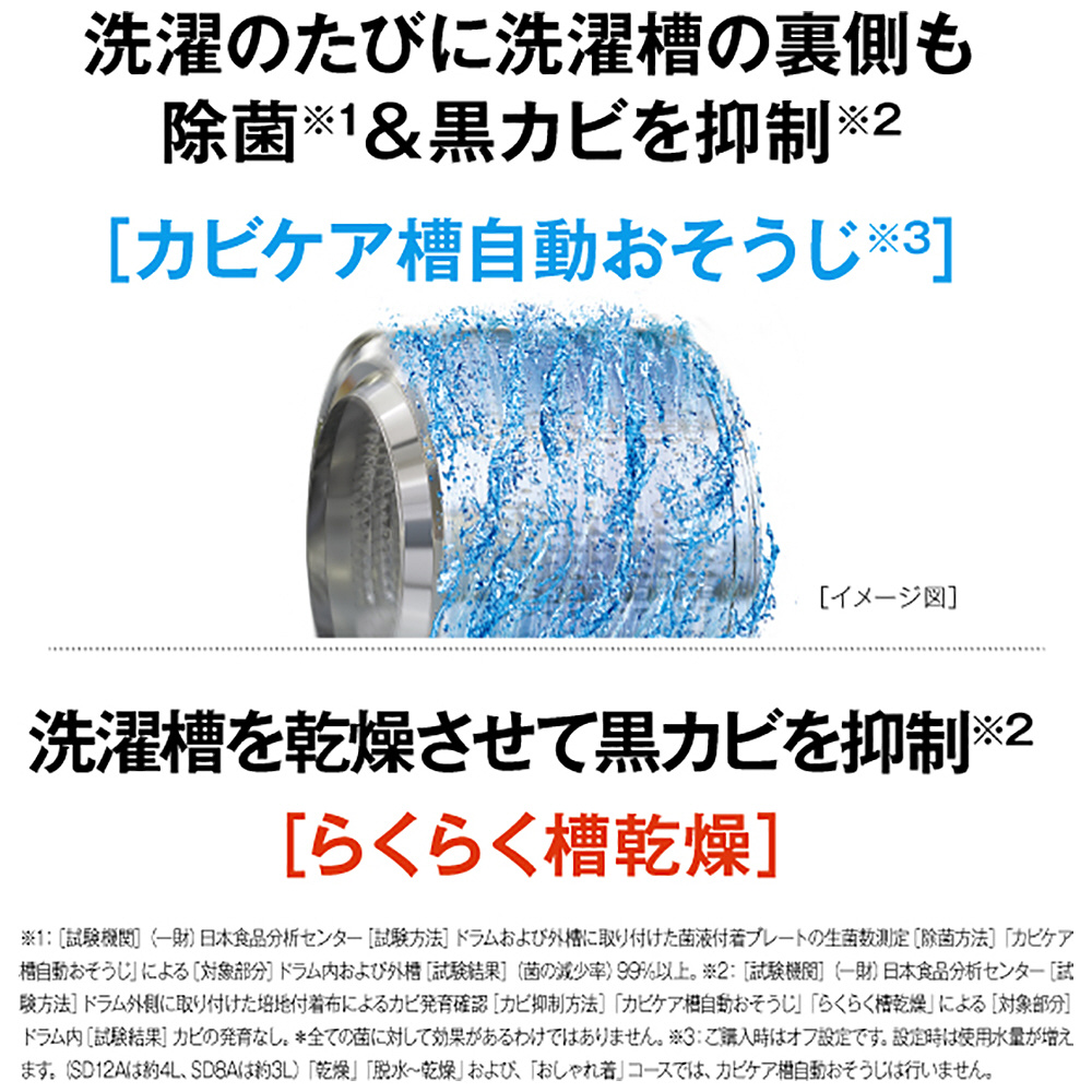 ※3:[試験機関](一財)日本食品分析センター [試験方法] 菌液付着試験布の生菌数測定 [除菌方法] 高温乾燥による [対象部分]ドラム内の衣類 [試験結果](菌の減少率)99%以上 *全ての菌に対して効果があるわけではありません。