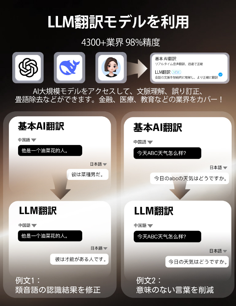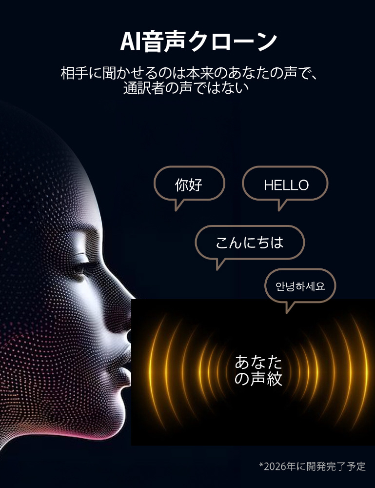 骨伝導センサーによる98%の高精度認識 わずか0.2秒で瞬時に翻訳 AIによる自動補正機能搭載 42言語、95アクセントに対応
