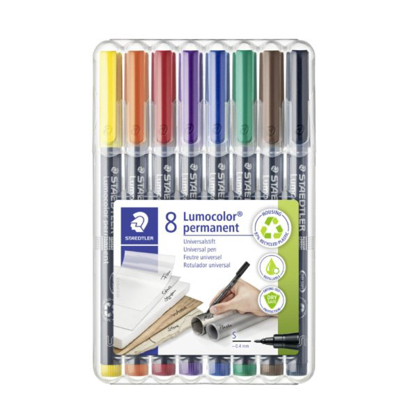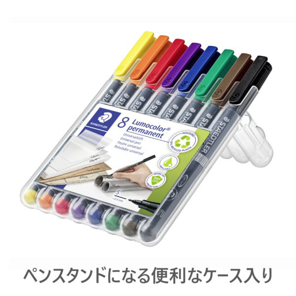 ルモカラー油性ペンは、優れた定着性で、ガラス・陶器・OHPフィルムなど様々なモノに書くことができます。ドライセーフインクがペン先に薄い皮膜を作り、2日間ペン先の乾燥を防ぎます。