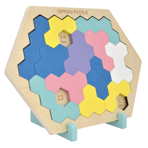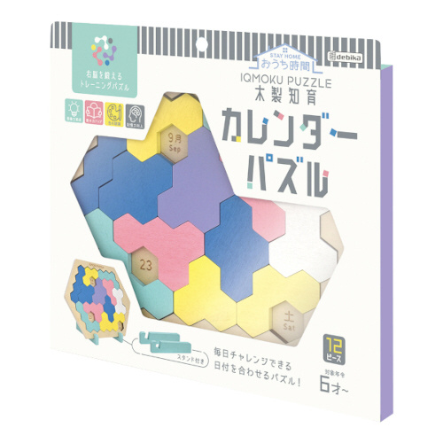 お子様からお年寄りまで、頭の体操になる優れたパズルです。六角形が連なった様々な形のピースをフレームにはめ込んで日付と曜日を表示するパズル。完成パターン&遊び方の説明書入り。