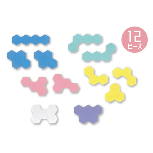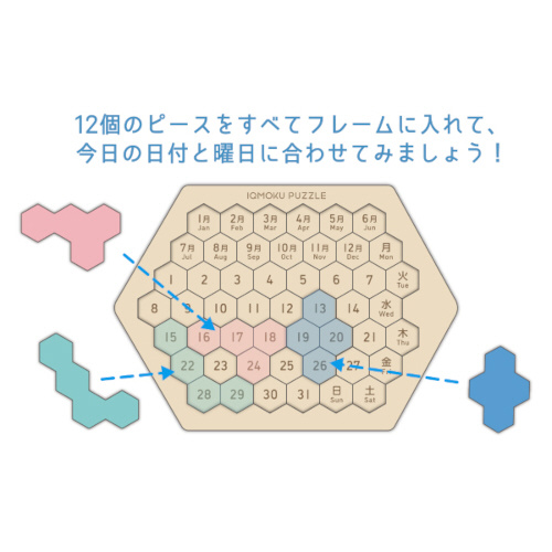 六角形が連なったような形の12個のピースをすべてフレームに入れて日付と曜日を表示させよう。祝日や記念日、イベントの日などに合わせたり、今日の日付を表示して毎日チャレンジして遊ぶパズル。