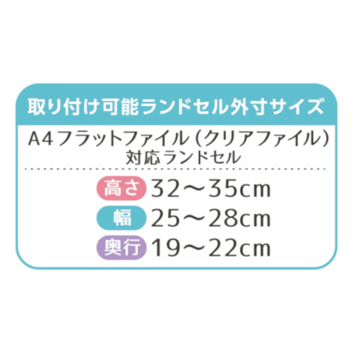 ・取り付け可能サイズ:A4クリアファイル・A4フラットファイル対応のランドセルに取り付け可能。高さ32〜35cm、幅25〜28cm、奥行19〜22cmまで取り付け可能。