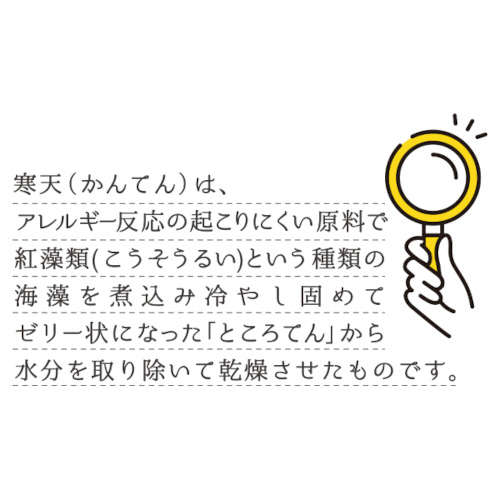 寒天は、アレルギー反応の起こりにくい原料で紅藻類という種類の海藻を煮込み冷やし固めてゼリー状になった「ところてん」から水分を取り除いて乾燥させたものです。