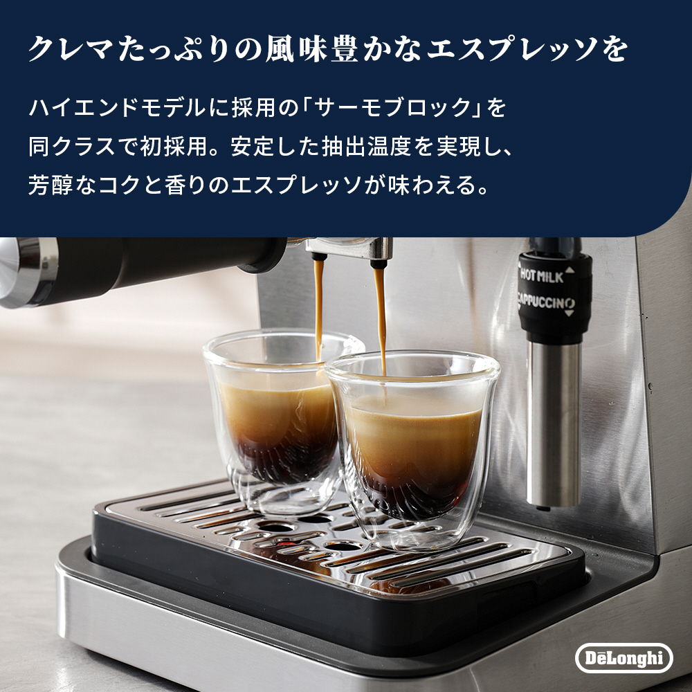 素早い予熱と安定した抽出温度を実現するサーモブロック搭載で、クレマたっぷりの芳醇なコクと香りのエスプレッソを味わえる