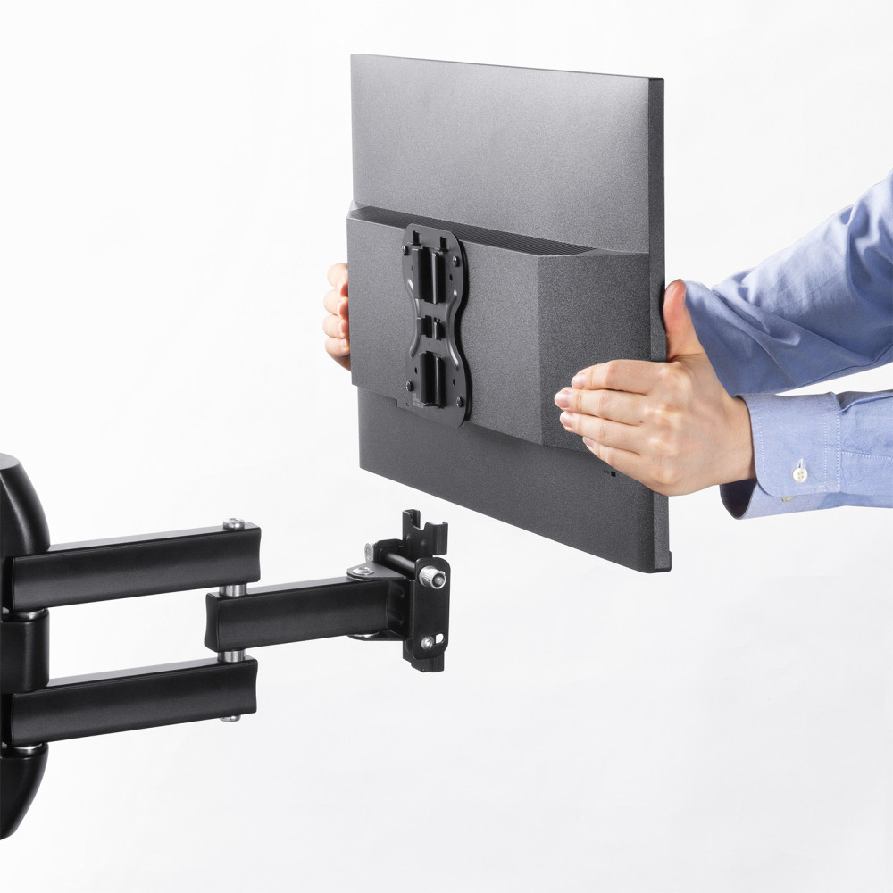 ●VESAブラケットは取外し可能で、モニターに取付けてからアームにスライドオンで設置可能で、取付けしやすくなっています。