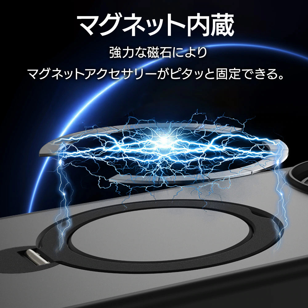本製品はマグネットアクセサリをケースの上から固定できる、落下防止やスタンドにもなるリングが付いた、ハイブリッドケースです。