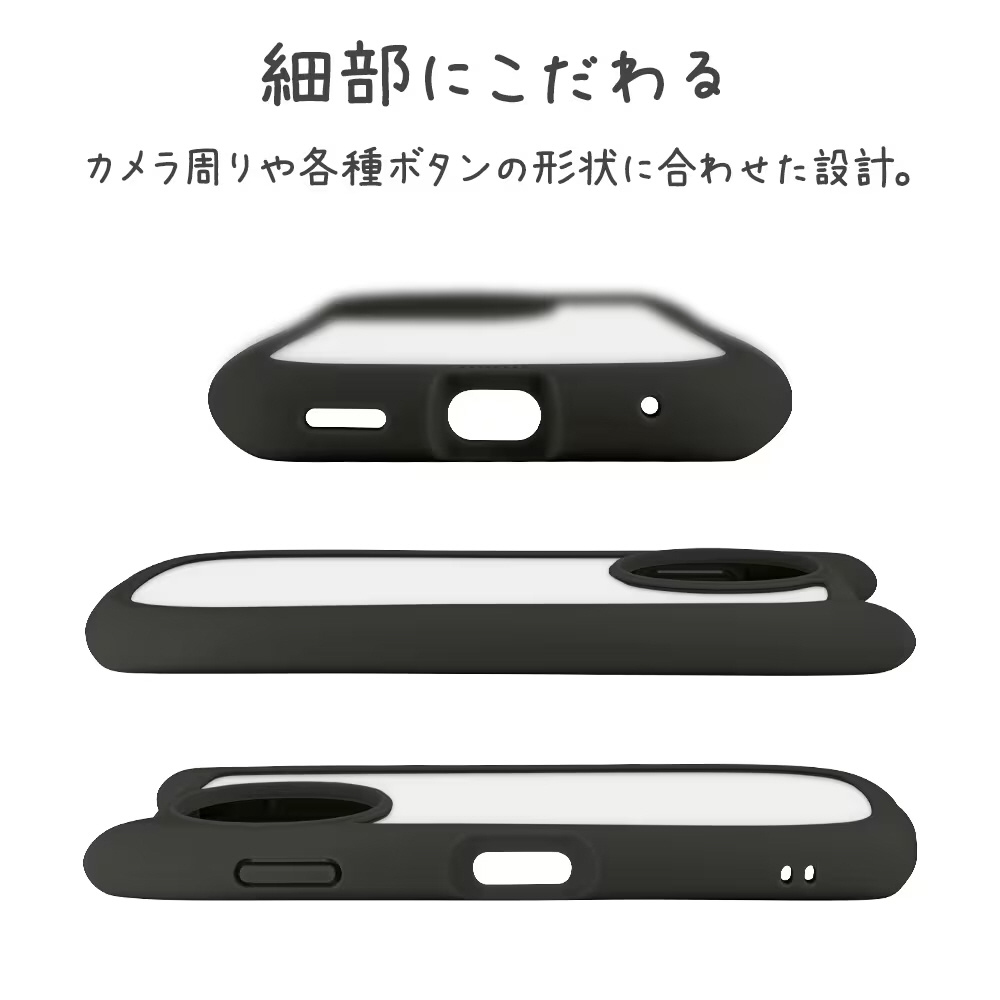 ●側面は弾力と柔軟性を兼ね備えたTPU素材で端末を衝撃から保護し、着脱も簡単です。※衝撃吸収については、一般的なポリカーボネート製ケースと比較した自社検証結果で、無破損、無故障を保証するものではありません。