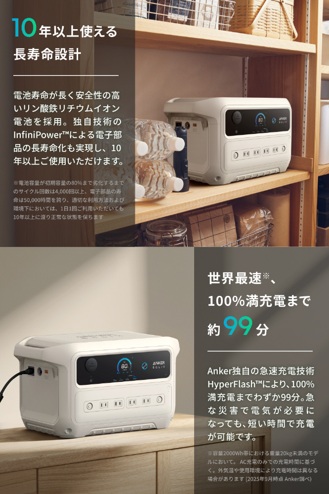2000Wh帯で世界最小※1サイズを実現。変換効率を改善し、一般的な2000Wh帯より最大約3倍※2長く家電を使える。Anker独自の急速充電技術HyperFlashにより、100%満充電までわずか99分。家族の防災に万全の備えが欲しい方に最適な大容量モデルです。※1 容量2000Wh帯のリン酸鉄リチウムイオン電池搭載モデルにおいて。ハンドル部分を除く体積計算に基づく (2025年9月時点 Anker調べ)※2 一般的な2000Wh帯のポータブル電源とLEDライトの使用時間で比較した場合。充電回数は各機器の定格消費電力に基づく計算上の数値 (Anker調べ) 。ご使用の機器の消費電力や使用状況により変動します