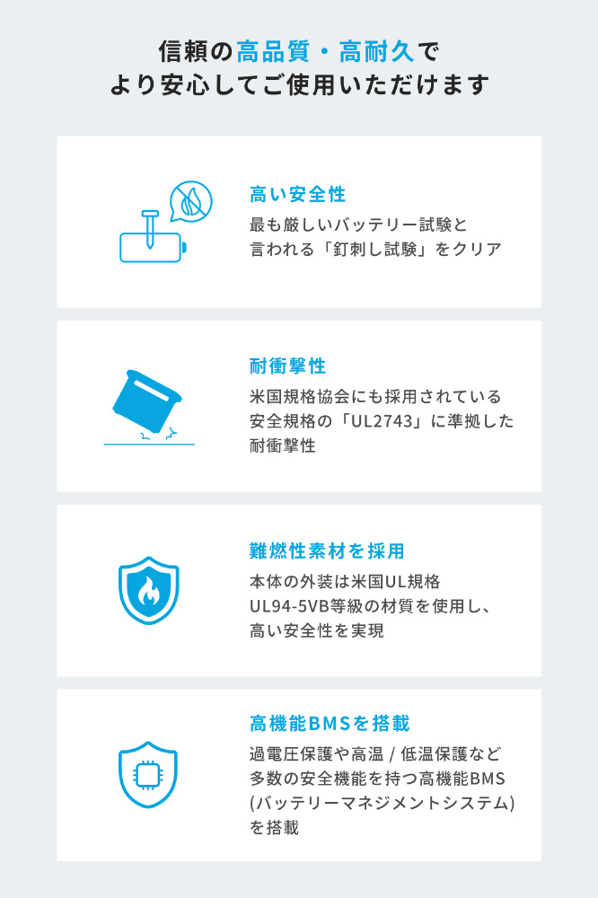 電池寿命が長く安全性の高いリン酸鉄リチウムイオン電池を採用。独自技術による電子部品の長寿命化も実現し、10年以上※ご使用いただけます。※電池容量が初期容量の80%まで劣化するまでのサイクル回数は4,000回以上、電子部品の寿命は50,000時間を誇り、適切な利用方法および環境下においては、1日1回ご利用いただいても約10年以上に渡り正常な状態を保ちます