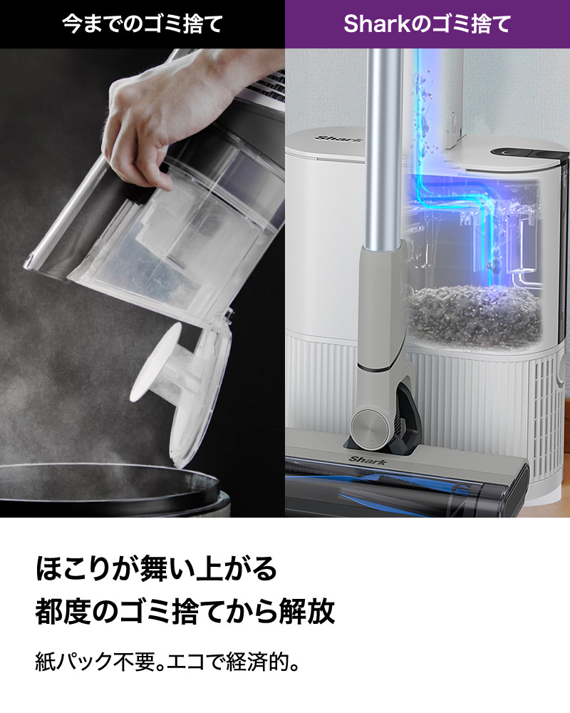 ■自動ゴミ収集ドックで充電しながらゴミを自動収集。手を汚さずホコリも舞い上がらない