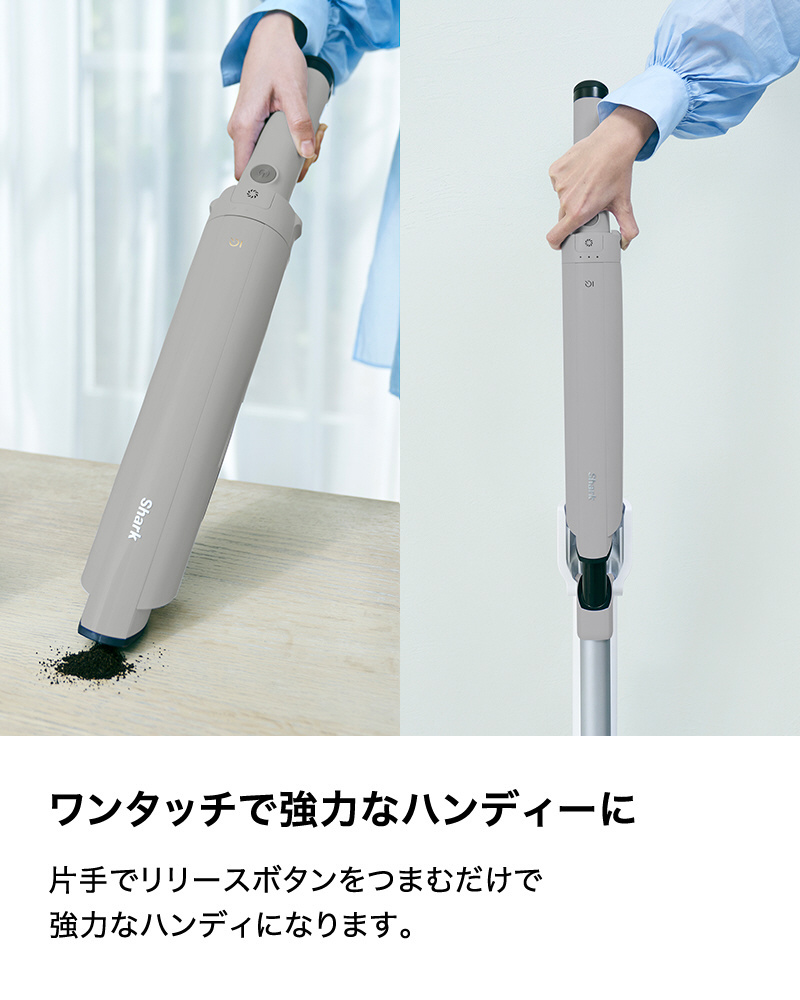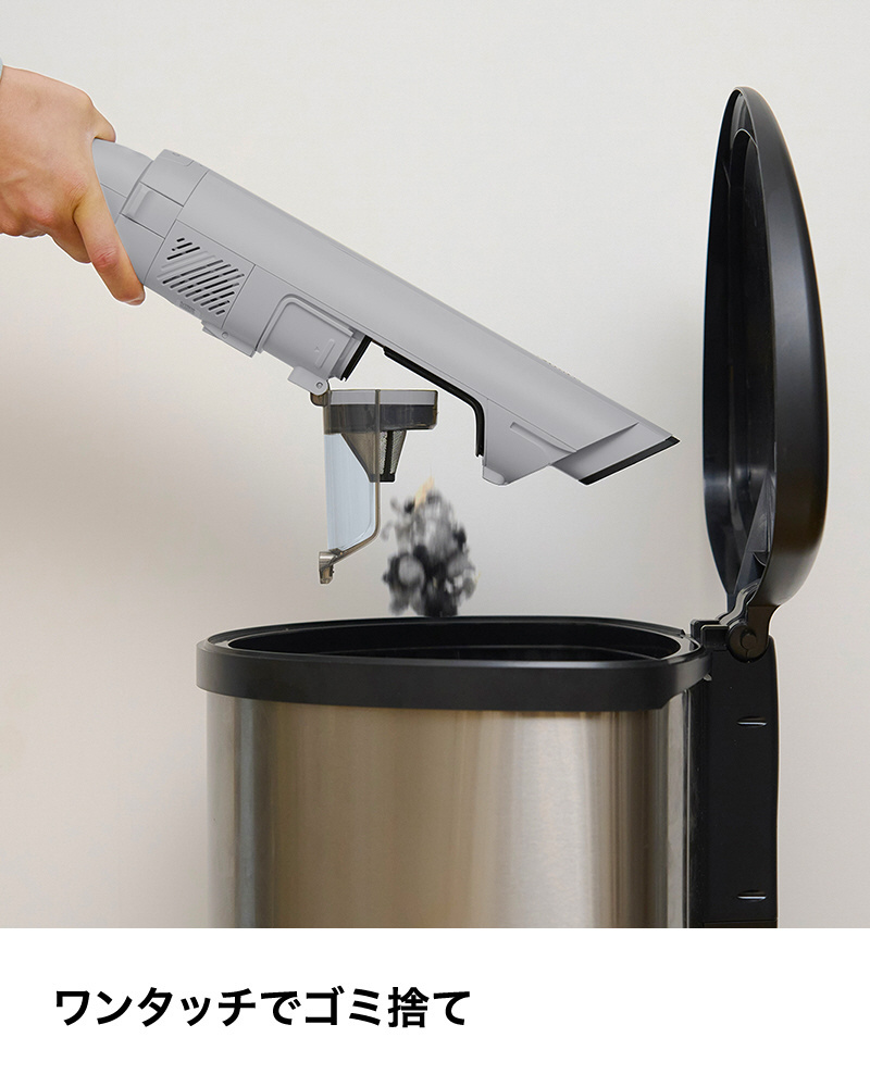 ■片手でリリースボタンをつまむだけで強力なハンディに。ボタンを押すだけでゴミ捨てが簡単。ゴミも飛び散りづらく、手を汚すことなく衛生的