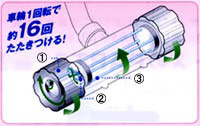 両サイドの車輪1回転につき、中の4本のたたき棒についた たたき玉で約16回ふとんをたたきます