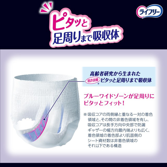 高齢者特有の足周りのモレを防ぐ夜用パンツ。ブルーワイドゾーンの吸収体が高齢者特有の細い足周りに面でフィット!足周りにすきまを作らず、伝ってくる尿もその場で吸収。さらに、独自の股下スリット構造とフィットギャザーにより吸収体が凹凸に沿って股下にフィット。股下のすきまを防ぎ、夜の寝姿勢でもモレずにしっかり吸収。