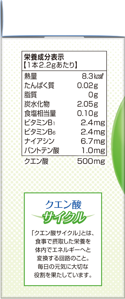 体内で栄養をエネルギーへと変換する“クエン酸サイクル”。そのはたらきのカギとなるクエン酸を配合し、さらに、クエン酸サイクルを支える4種のビタミンB類をプラス。
