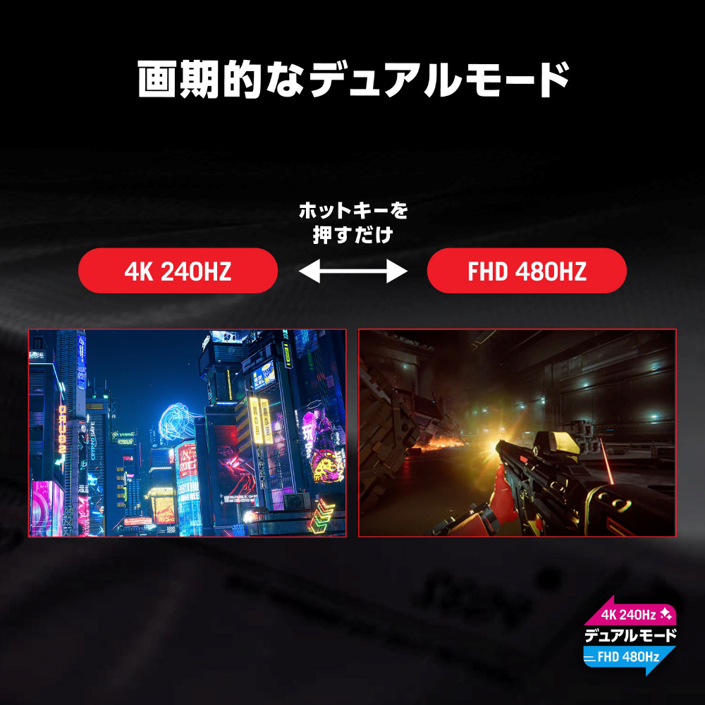 リフレッシュレートを重視した高速表示と、高解像度による没入感のある映像体験を用途に応じて切り替えることができます。ホットキーを押すだけで、4K/240Hzの高精細表示と、FHD/480Hzの高速表示を瞬時に切り替え可能。FPSゲームやAAAタイトルなど、ジャンルに応じた最適な表示モードで快適なプレイをサポートします。