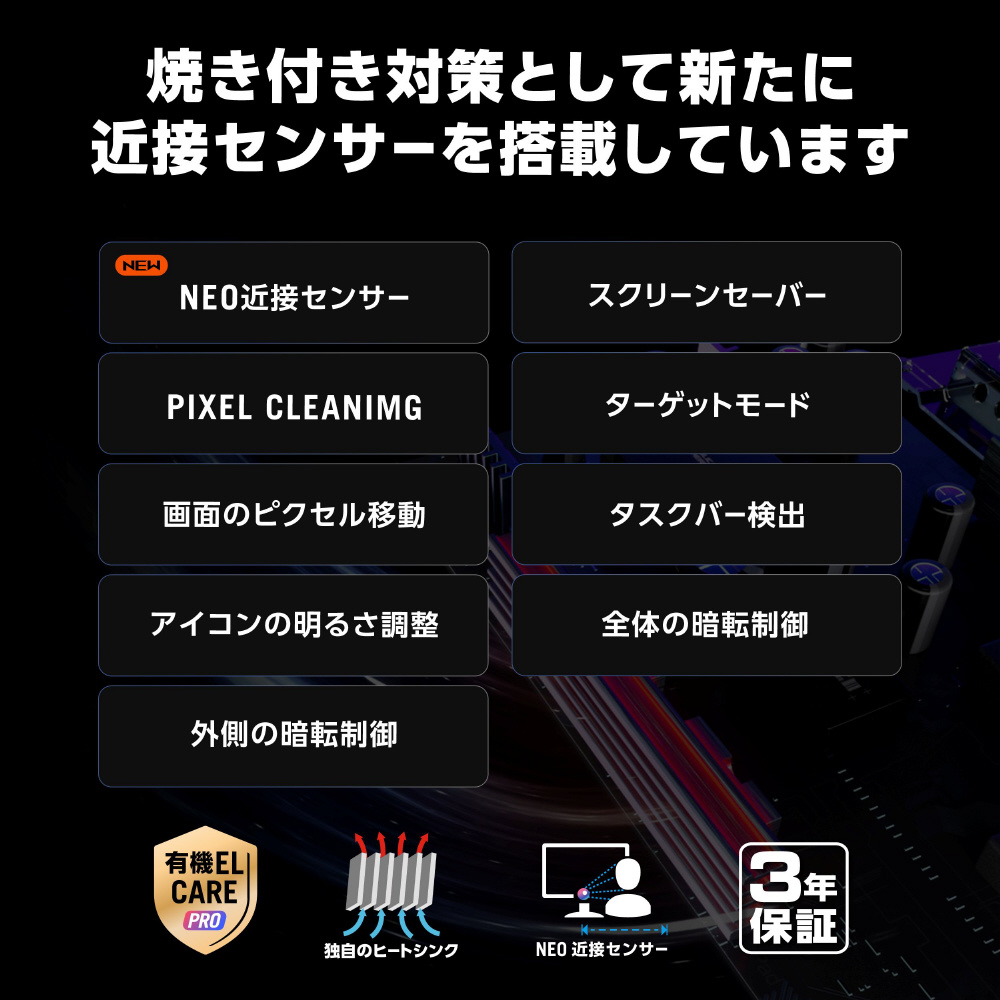 ROGの有機ELモニターは、長期間にわたって高品質な映像体験を提供できるよう設計されています。独自のカスタムヒートシンクと内部エアフロー設計により、冷却性能を高め、焼き付きリスクの低減に貢献します。さらに、3年間の製品保証が付属しており、安心してご使用いただけます。