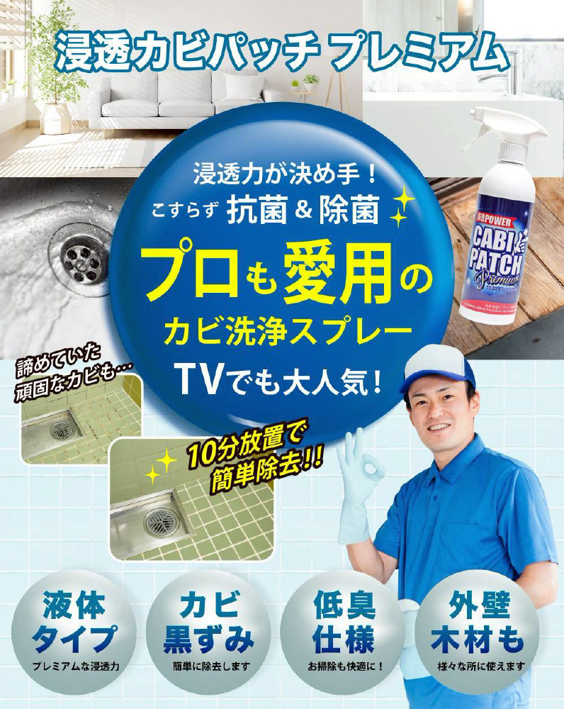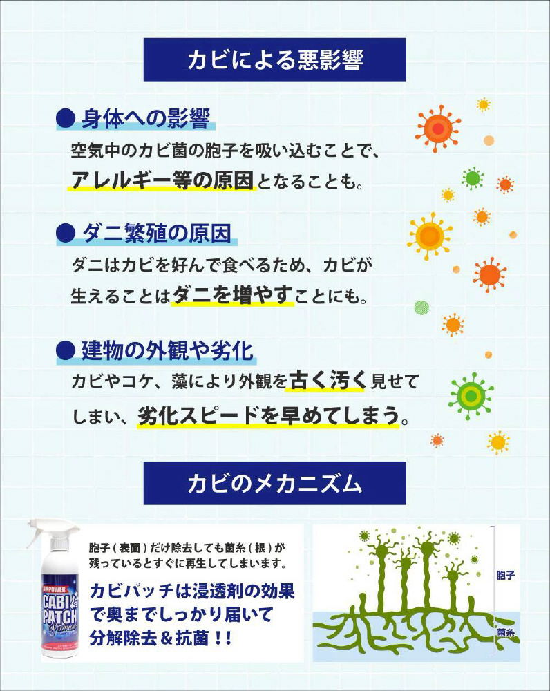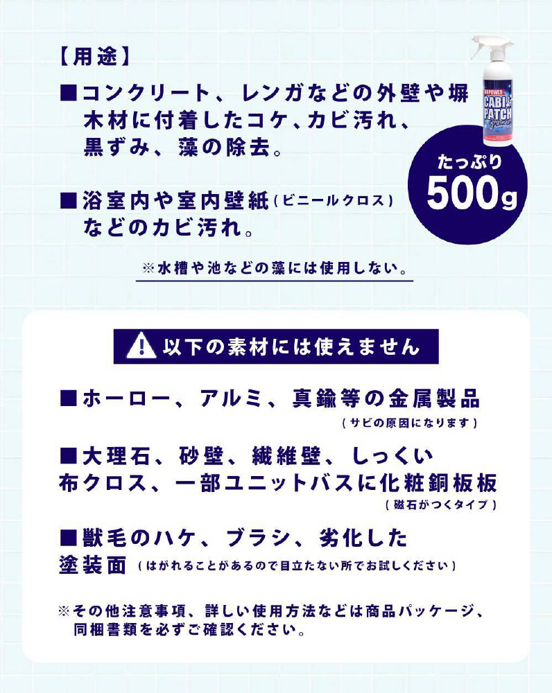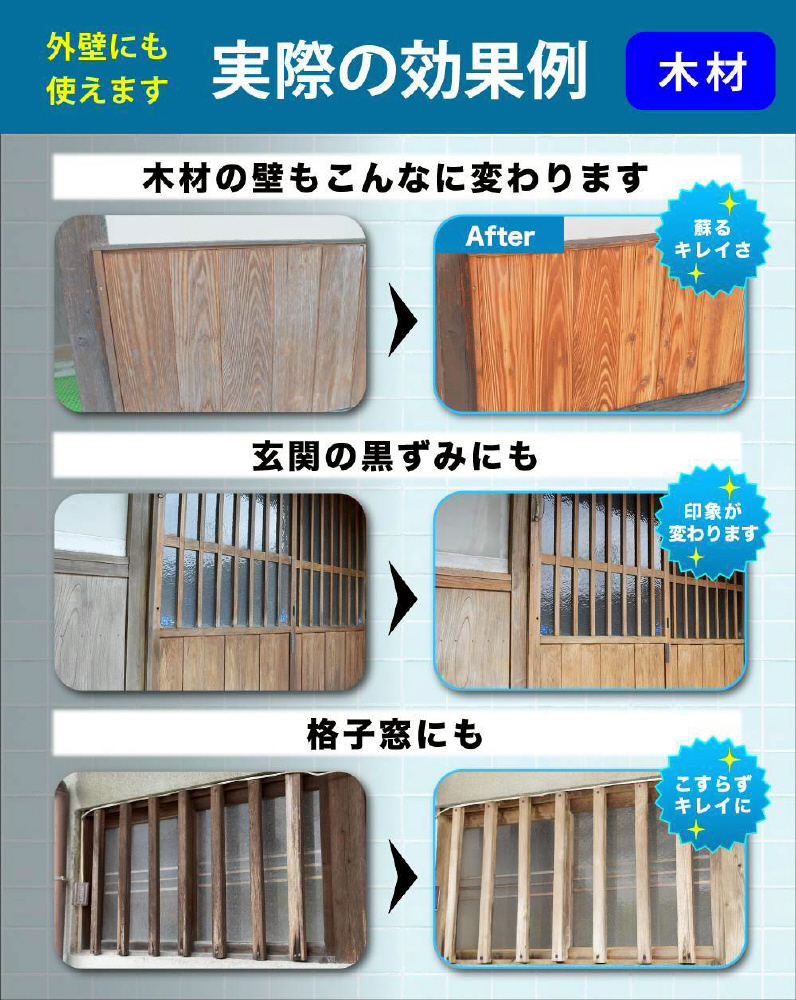 カビ・黒ずみを落とすだけでなく、使った後もカビの生えにくい環境へ。水周りだけでなく、コンクリート、レンガ等の外壁、木材に付着したコケ、カビ汚れも除去。