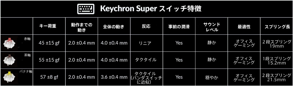 K8 Version 2では、ほぼすべての3ピンおよび5ピンのMXスタイルメカニカルスイッチ(Cherry、Gateron、Kailh、Pandaなど)に対応。