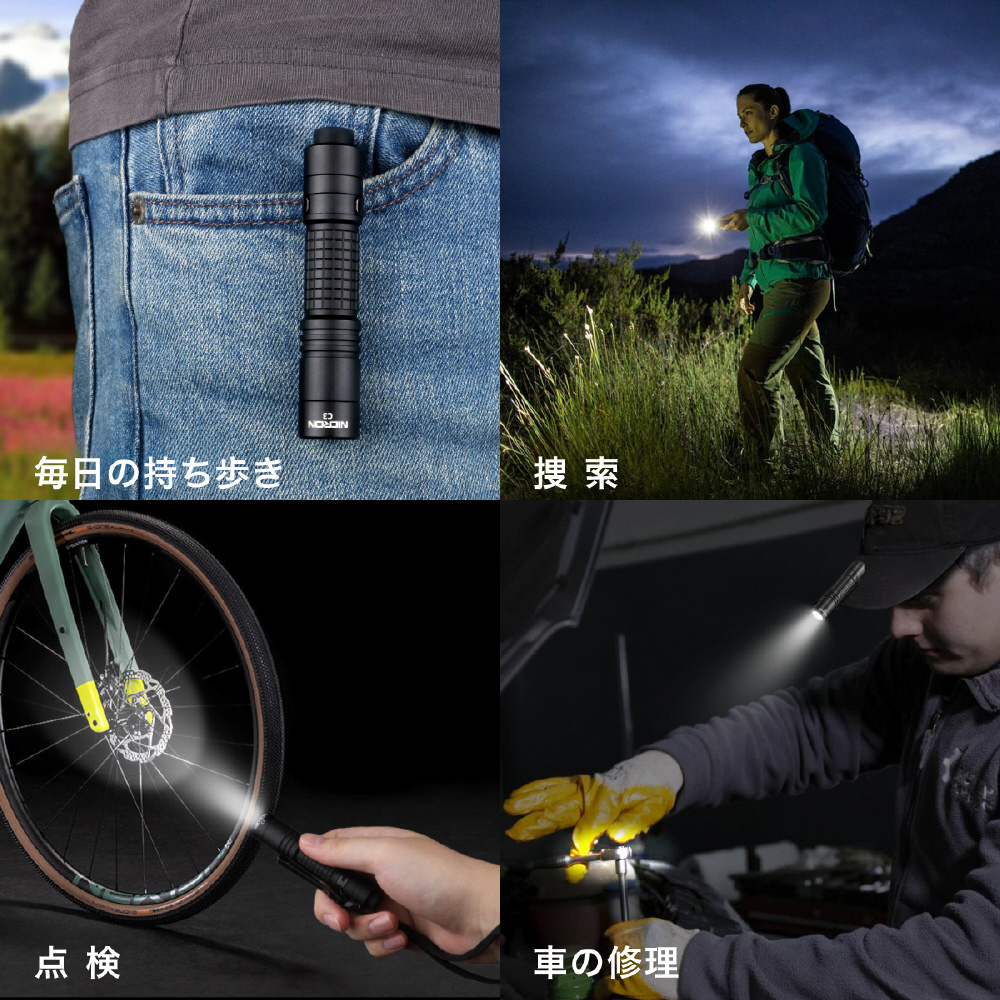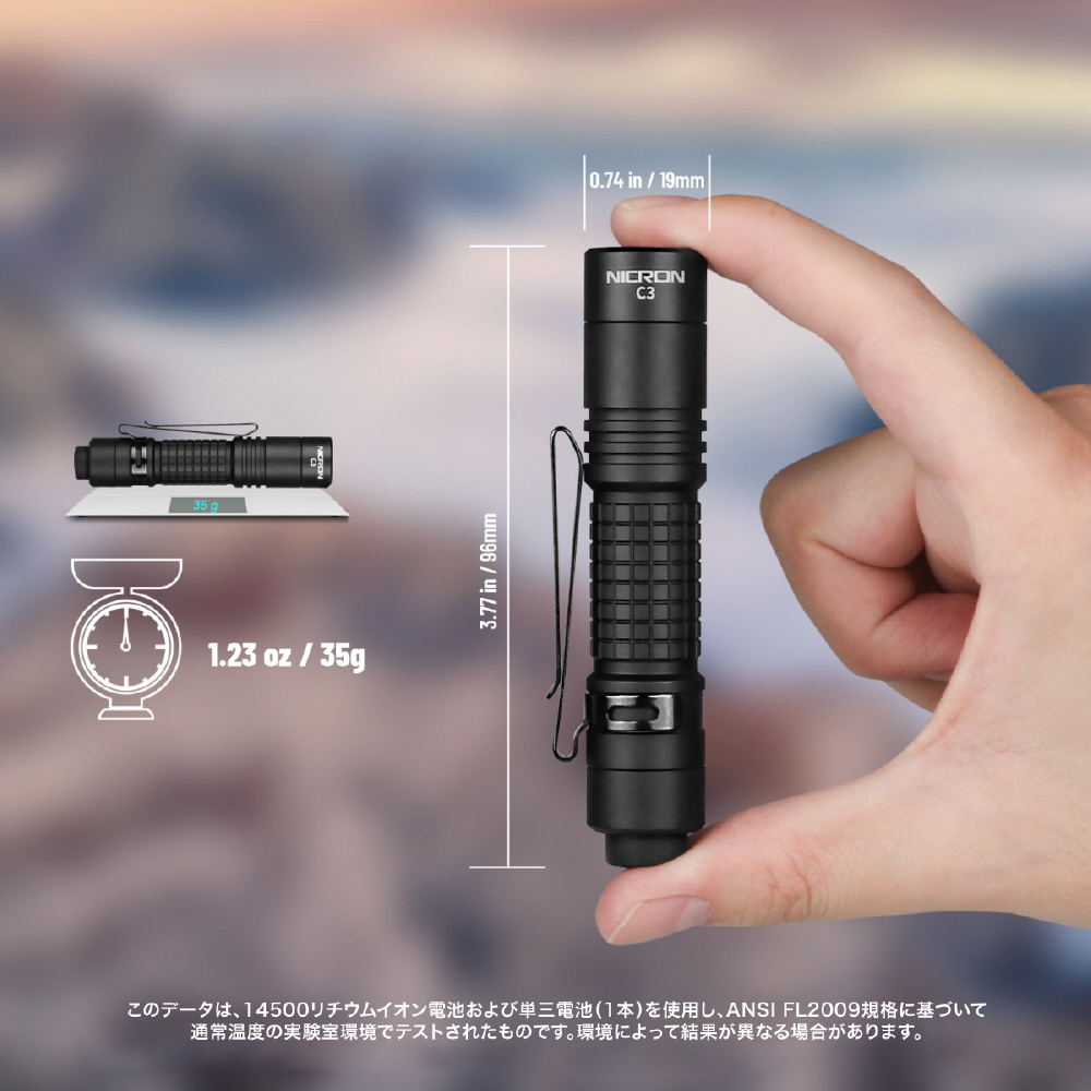 ●明るさ3段階調整可能。●最大1000LM●最大照射距離100m●電池の充電については、本体から電池を取り出し直接充電を行ってください。●クリップ付き、ベルトやポケットにも装着が可能。●底面でバッテリーの残量が表示されます。●充電中は赤色ランプ、満充充電で緑色に点灯します。●専用電池のほかに、単三電池1本でも点灯が可能ですが、表記の性能を下回る明るさになります。●点滅モード、SOSモード搭載