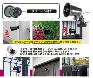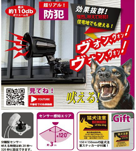 大型犬の吠え声をリアルに再現して不審者を威嚇することができるため、センサーライトと違い昼間でも効果が見込めます。
