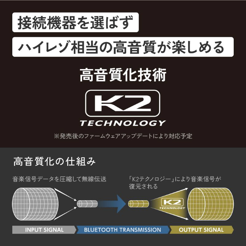 独自のデジタル高音質化技術「K2テクノロジー」は、接続する機器やコーデックに依存せず、オリジナルマスターに迫るクオリティでハイレゾ相当の高音質を再現※3。ワイヤレスでも繊細で解像度の高い音質体験を実現します。