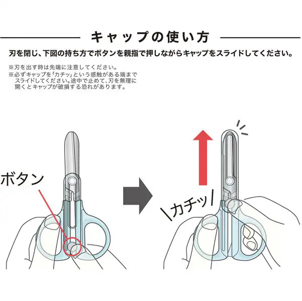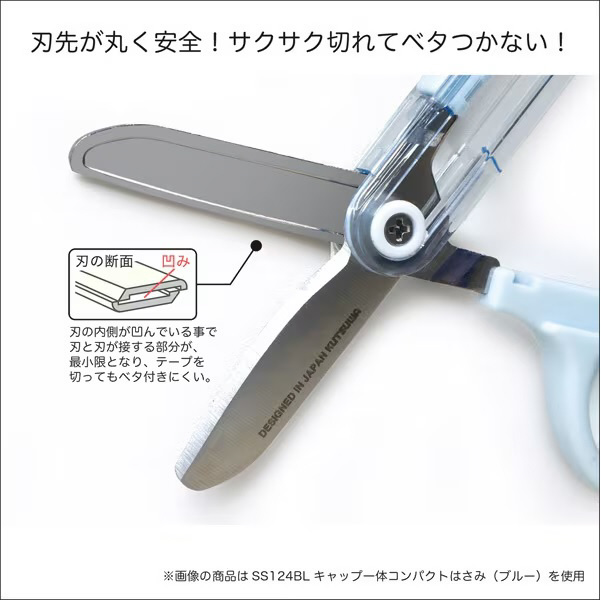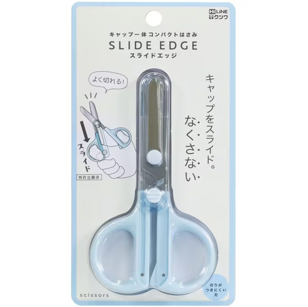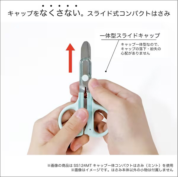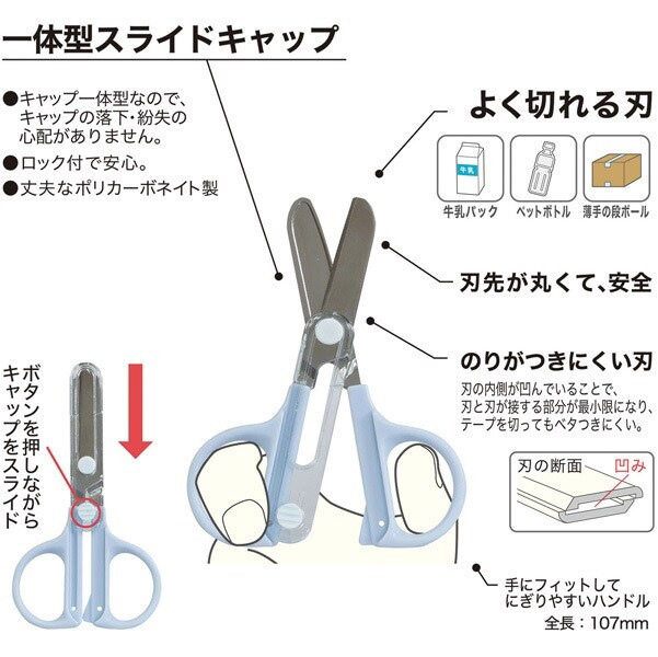 「キャップ一体ハサミ」のコンパクトタイプが新発売。ハサミのキャップがスライド式で一体になっているので、なくす心配が有りません。刃先は丸く、糊がつきにくい刃になっています。