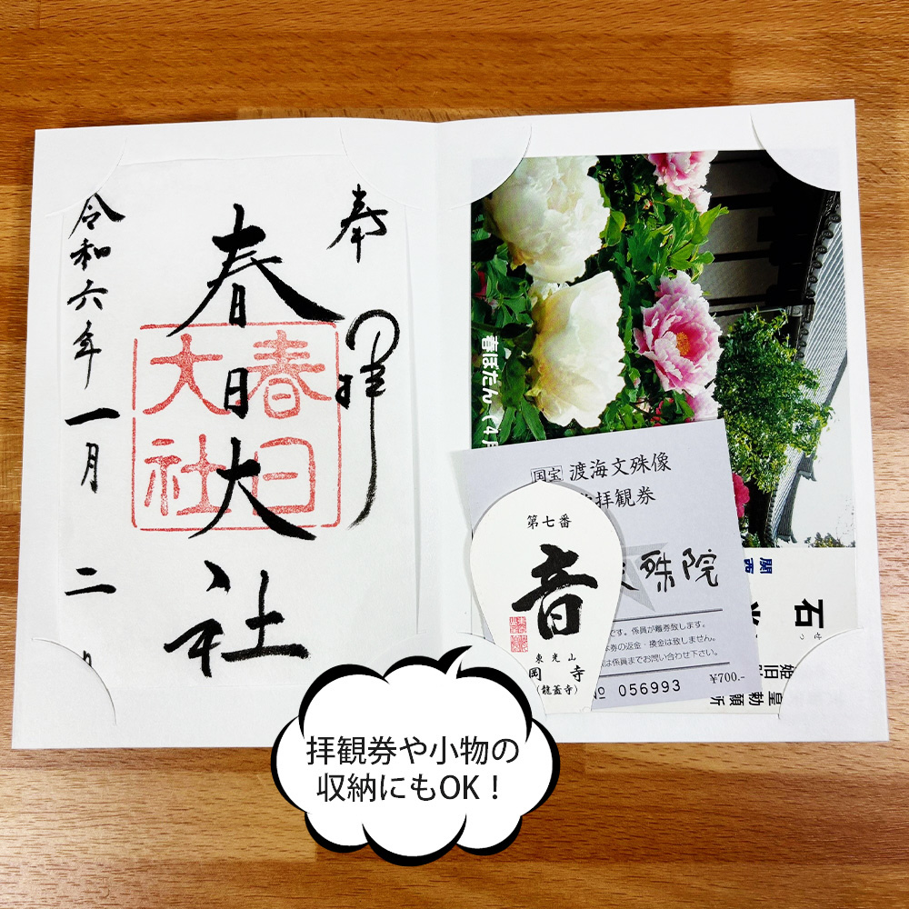 御朱印を集印する以外にも、御城印や駅記念スタンプの集印、旅行の日記帳などとしてもご使用いただけます。 ※御朱印帳の柄の出方は商品によって異なります。 ※切り込み部分に墨が多く入った場合、裏面に染み込むことがあります。