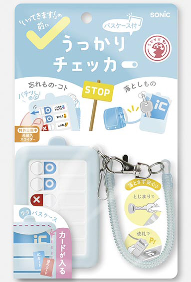 「うっかりチェッカーパスケース付 スパイラルチェーンで落とさない」は、「いってきます!」の前に、カンタンチェックでSTOP忘れ物。大事なものはウラ面のパスケースにまとめてSTOP落としもの。スパイラルチェーン付だから落とさず安心♪