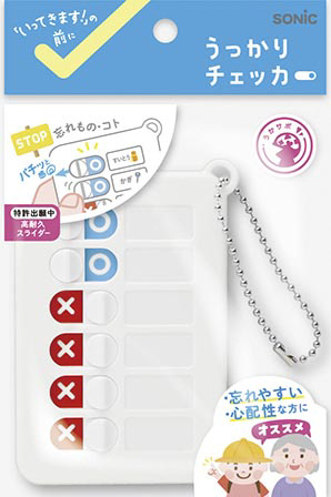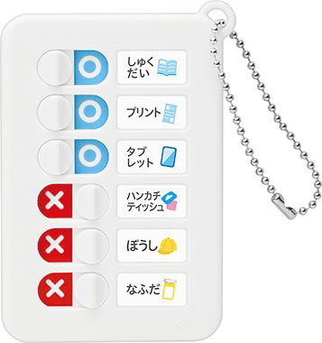 「うっかりチェッカー ボールチェーン付」は、【もちもの】【朝の支度】【とじまり】【帰ってからやること】など、いろんなシーンの忘れもの・コトチェックにお役立ち。心配性な大人の方にもオススメ♪外出時、とじまりの不安対策にも。コンパクトだから、玄関扉のフックに吊り下げたり、目に入る所においておける。34種類+フリー項目6枚のチェックシール付。